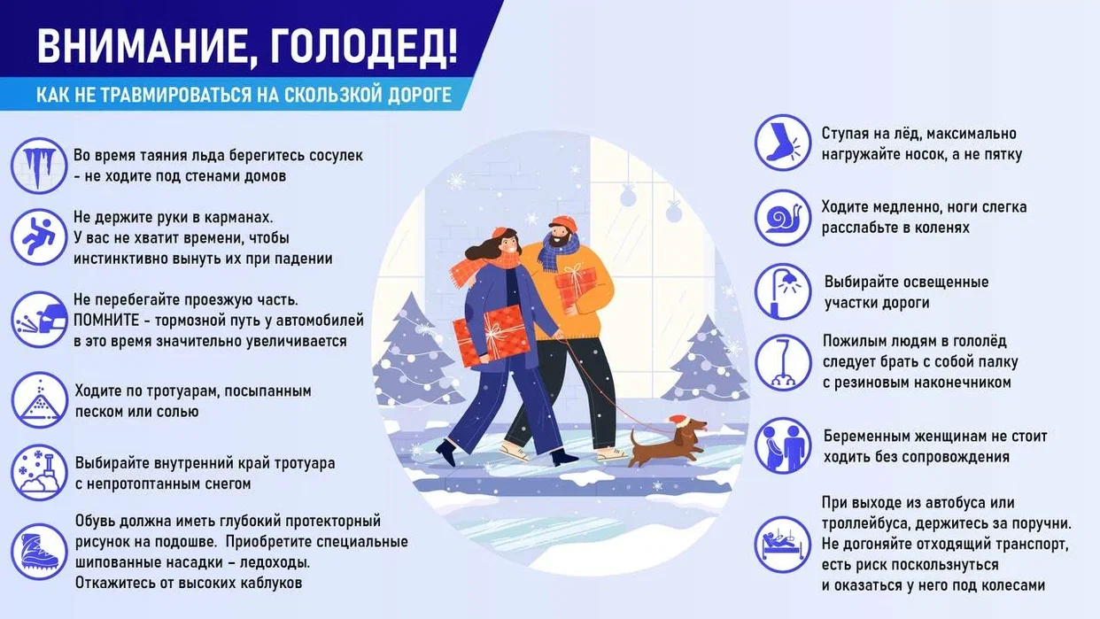 Остерегайтесь гололеда и тающего снега! Будьте внимательны при ходьбе, выбирайте обувь с нескользящей подошвой. Опасность сосулек и наледи! Не ходите под крышами зданий, с которых свисают сосульки или наледь. Сообщайте взрослым об опасных местах.