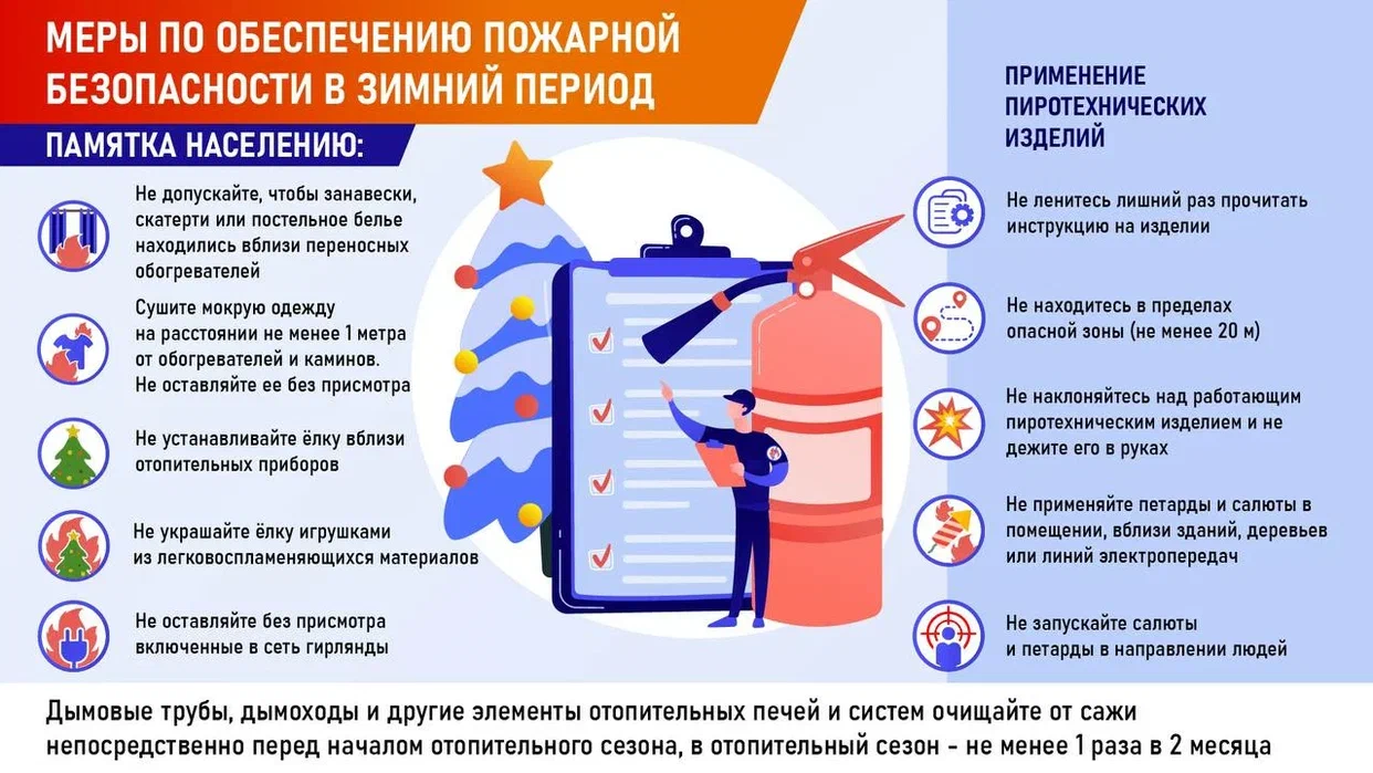 Новогодние праздники — это время радости, веселья и семейного тепла. Однако именно в этот период возрастает риск возникновения пожаров из-за несоблюдения мер предосторожности. Чтобы новогодние каникулы прошли весело и безопасно, важно соблюдать ряд простых, но эффективных правил. Основные рекомендации: 1. Аккуратнее с пиротехникой