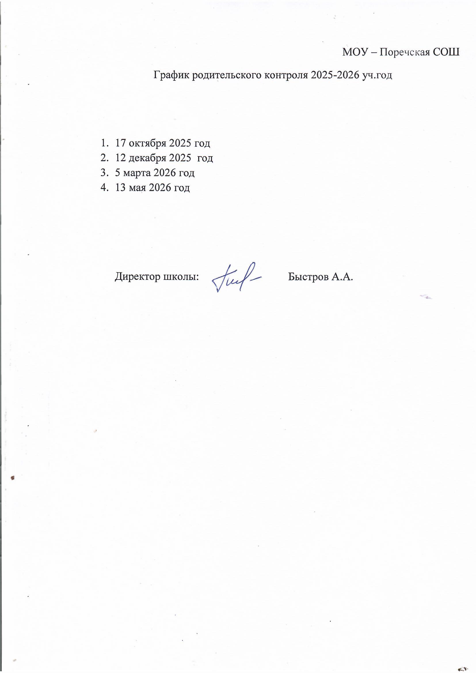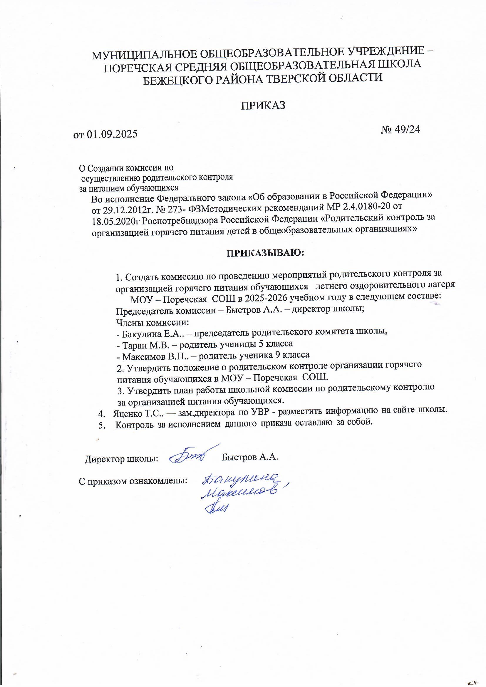 Приказ о комиссии по контролю питания